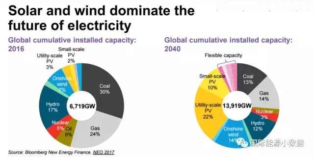 中國(guó)儲(chǔ)能網(wǎng)訊:根據(jù)彭博新能源財(cái)經(jīng)(BNEF)的數(shù)據(jù),2016年全球電力裝機(jī)6719吉瓦,其中煤電占比30%,其次是天然氣發(fā)電(24%)、水電(17%)、陸上風(fēng)電(7%)、燃油(6%)、光伏(5%)、核電(5%)??梢姡?016年化石能源發(fā)電容量占比達(dá)到60%.