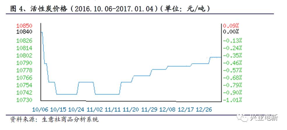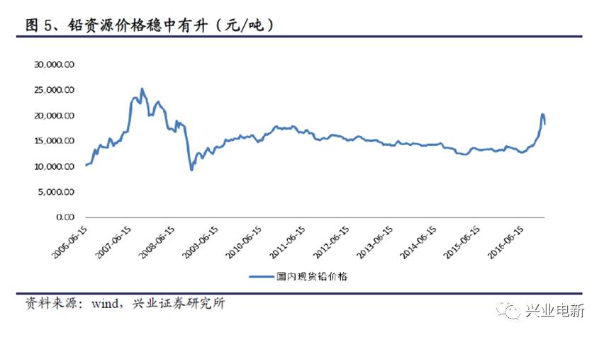 從圖4中可以看到,2016年下半年,活性炭?jī)r(jià)格先有一個(gè)明顯下跌,之后緩慢回升。此系列的上一篇報(bào)告中分析可以知道,近些年來鉛資源的價(jià)格大體呈先較為穩(wěn)定的狀態(tài),但在近半年價(jià)格有一定幅度的提升,具體走勢(shì)圖見圖5。