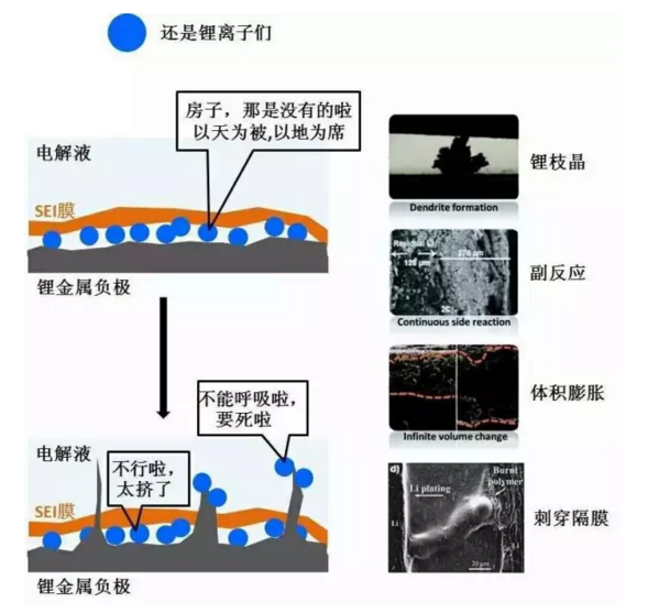 但是,隨著沉積的鋰金屬越來越多,地方變得擁擠了(沒辦法,沒房么,混著住唄),同時會產(chǎn)生極度不均勻的鋰金屬表面形貌,行業(yè)中稱這種現(xiàn)象為鋰枝晶生長。更加可怕的是,鋰離子們特別喜歡在有鋰枝晶的地方扎堆,讓局部的鋰枝晶越長越大,最終撐破SEI膜。當(dāng)這種情況發(fā)生的時候,悲催的一部分鋰金屬被暴露在充滿電解液的世界,就像坐著火箭的人沖出大氣層,卻忘了穿宇航服,直接就“立地成佛”了。