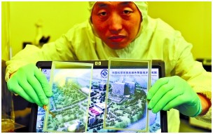 圖為中科院重慶綠色智能技術(shù)研究院的一名研究人員在展示單層石墨烯產(chǎn)品(右)的超強(qiáng)透光性。(CFP 供圖)