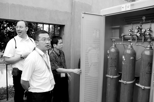 圖為中外專家參觀燃料電池在通信基站的應(yīng)用。