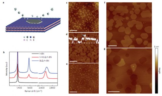 圖1:石墨烯在六方氮化硼上的外延生長(zhǎng)示意圖以及AFM、拉曼的表征。