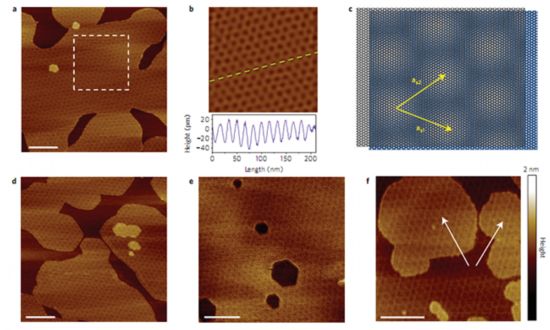 圖2:通過AFM表征可以清晰地在各種不同生長(zhǎng)階段的樣品觀測(cè)到~15nm的石墨烯二維超晶格結(jié)構(gòu)。