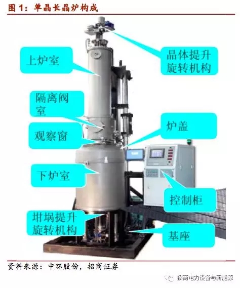 單晶爐系統(tǒng)包括基座、坩堝提升旋轉(zhuǎn)機構(gòu)、主爐室(下爐室)、翻板閥、副爐室(上爐室)、晶體提升旋轉(zhuǎn)機構(gòu)、液壓驅(qū)動裝置、真空系統(tǒng)、沖氬氣系統(tǒng)及水冷系統(tǒng),另外還有電氣部分,控制柜、加熱系統(tǒng)等。其中主爐室是單晶爐的心臟部位,熱場系統(tǒng)安裝在內(nèi),由于熱場的原材料主要是石墨,因此熱場石墨又稱為石墨熱場。
