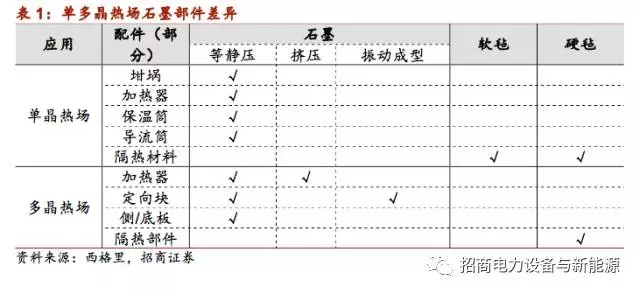 單晶熱場石墨配件的原材料等靜壓石墨不可用其他石墨材料替換:從下表可以看出,單晶長晶熱場的坩堝、加熱器、保溫筒等主要配件無法用其他較低品質(zhì)的石墨制品代替,而多晶熱場的加熱器、定向塊雖然也需要等靜壓石墨,但也可也能夠擠壓或震動成型石墨這些石墨代替。