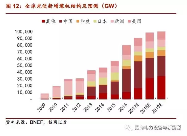 全球其他國家光伏裝機需求持續(xù)增加:全球光伏裝機歷史數(shù)據(jù)顯示,過去幾年中國、美國、日本、印度、歐洲的德國、英國等國家新增裝機占全球比超過80%以上,是光伏裝機的主要需求來源。未來雖然部分小國需求會崛起,但是大國裝機需求也將占據(jù)全球的70%以上。美國未來部分州市場啟動,光伏裝機穩(wěn)步上升;日本市場補貼下調(diào)可能會有小幅下滑;印度市場遠(yuǎn)未達到指引量,未來將大幅上升;歐洲土耳其等小國需求出現(xiàn),未來裝機穩(wěn)步增長;智利等小國實現(xiàn)平價,內(nèi)生性需求出現(xiàn)。