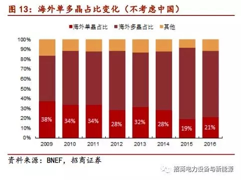 單晶組件未來將是趨勢。海外單晶性價比有待提升,未來占比將上升:海外市場的單多晶組件價差保持在6-10美分/W左右波動保持動態(tài)平衡,隨著BOS(非組件成本)的下降,單晶組件性價比優(yōu)勢不明顯。隨著像隆基股份這樣有成本優(yōu)勢的企業(yè)的海外戰(zhàn)略的推進,單多晶組件價差將會縮小至6美分以下,單晶的性價比將凸顯,海外占比將上升。