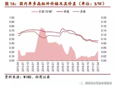 國內(nèi)價差縮小,推動單晶滲透率不斷提升:國內(nèi)裝機2014年開始應(yīng)用單晶組件,2015年與2016年由于隆基股份單晶硅片成本迅速下降,單晶組件價格僅高于多晶組件0.1元/瓦,所以單晶組件在國內(nèi)占比迅速由5%上升至27%,預(yù)計今年國內(nèi)單晶組件占比將上升至35%。