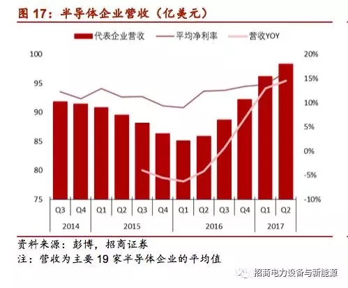 上半年半導(dǎo)體價格上漲帶動企業(yè)營收上漲:由于上半年半導(dǎo)體產(chǎn)品價格普遍上揚,如快閃儲存器價格從2016年下半年起上漲達11.6%、PCDRAM合約均價從2016年一季度至今漲幅逼近40%,因此半導(dǎo)體各企業(yè)的營收相比此前有較大幅度上升,就統(tǒng)計主要企業(yè)的營收來看同比增速達到15%,環(huán)比增速也達到2%。