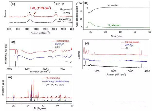 (a)液氨中合成LiO2的現(xiàn)場拉曼光譜數(shù)據(jù)(b)液氨中合成的LiO2在放置一段時間后產(chǎn)生N2的質(zhì)譜數(shù)據(jù)(c-e)液氨中LiO2最終轉變?yōu)長iOH和LiOH?H2O紅外光譜,拉曼光譜和x-射線研究結果。