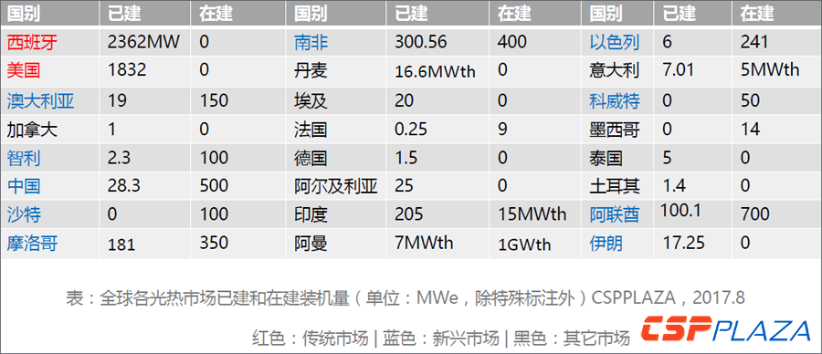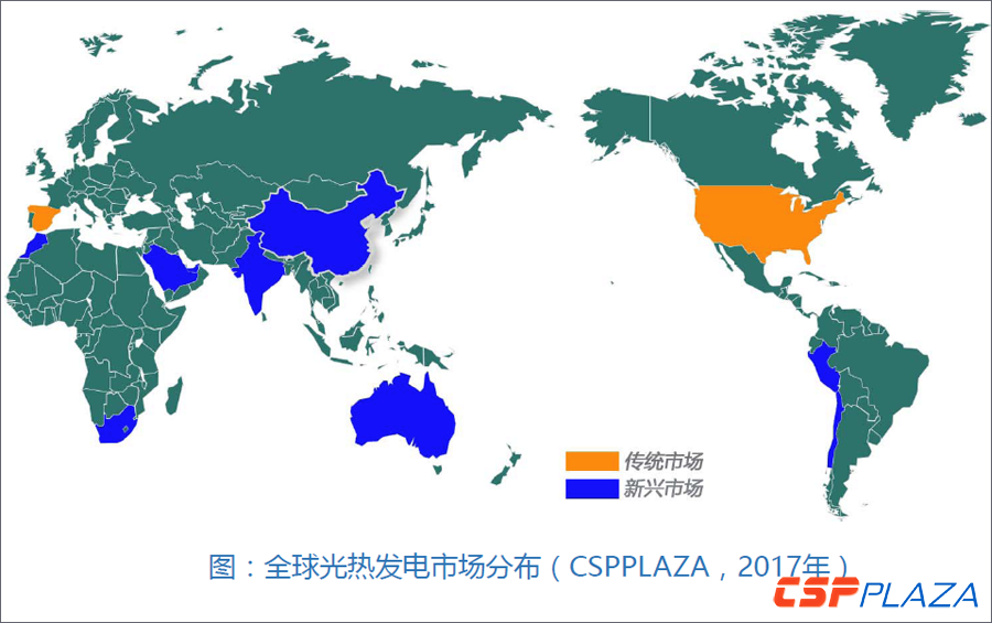 這張圖是我們簡單做的一張圖,是我們對全球市場目前分布的一個統(tǒng)計(jì),2016年底的全球建成總裝機(jī)是5017MW,那么在這張圖上有藍(lán)色和橙色的,這個橙色的代表的是兩個傳統(tǒng)的市場,西班牙和美國兩大市場,這個藍(lán)色的代表的是新興市場,目前在開發(fā)的新興市場。當(dāng)然這個圖比較小,一些小的國家沒有標(biāo)識出來,同時還有比較有潛力的一些市場沒有在這張圖上標(biāo)出來。總體來說目前建有光熱發(fā)電項(xiàng)目的國家共計(jì)24個,包括西班牙、美國、澳大利亞、加拿大、智利、中國、摩洛哥、沙特阿拉伯、南非、丹麥、埃及、法國、德國、阿爾及利亞、希臘、印度、以色列、意大利、科威特、墨西哥、泰國、土耳其、阿拉伯聯(lián)合酋長國、阿曼。大家從這張世界地圖上可以看到光熱確實(shí)吸引了國際上很多市場的參與,很多國家都在發(fā)展這個行業(yè)。