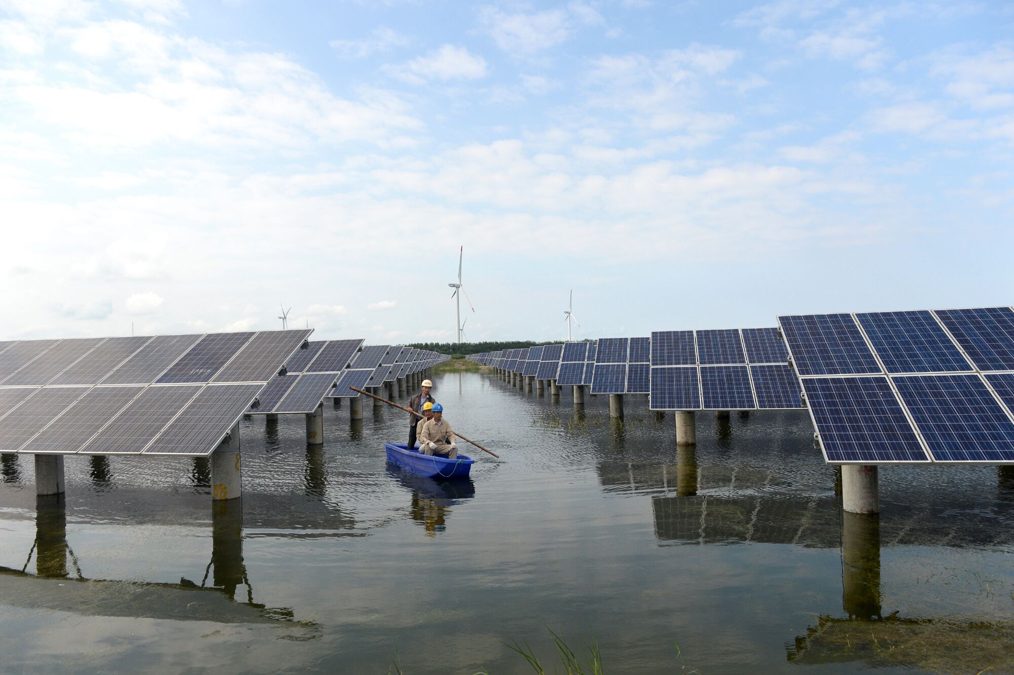 9月10日,國(guó)網(wǎng)海安供電員工乘船巡檢江蘇海東光伏35兆瓦漁光互補(bǔ)項(xiàng)目。