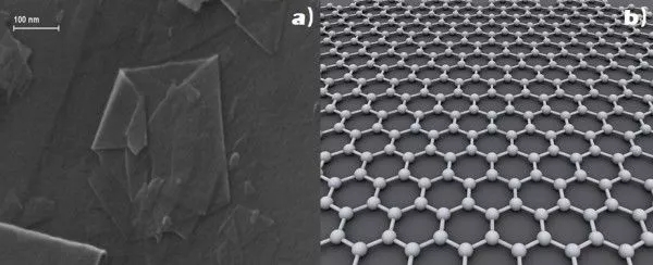 石墨烯首先于2004年[1] 被分離出來,研究顯示這是一種具有單層原子厚度的雜化型的碳,圖1a所示即為單層石墨烯薄片在掃描電子顯微鏡下的觀測圖,具有碳原子形成的原子尺寸的蜂巢晶格,如圖1b所示。