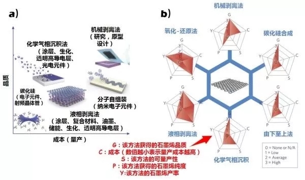 圖4 幾種常見的石墨烯制備方法的比較:晶體品質(zhì)VS量產(chǎn)成本(a)和五種常用評價指標的雷達圖(b)