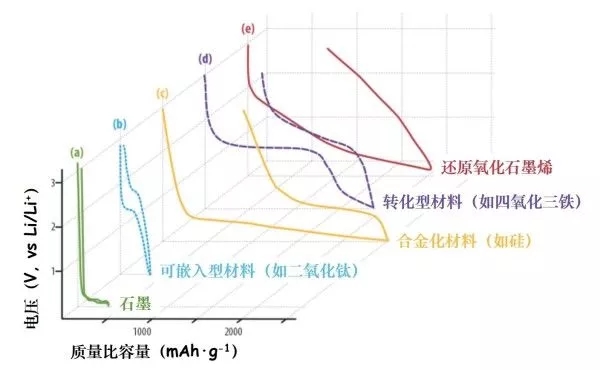 圖5 幾種典型鋰離子電池負極材料的電位曲線對比:a)鋰嵌入石墨、b)鋰嵌入高電壓氧化物(比如二氧化鈦TiO2)、c)可以與鋰進行合金化的材料(如硅Si)、d)會與鋰進行轉(zhuǎn)化反應的材料(比如四氧化三鐵Fe3O4)以及d)還原氧化石墨烯中的儲鋰