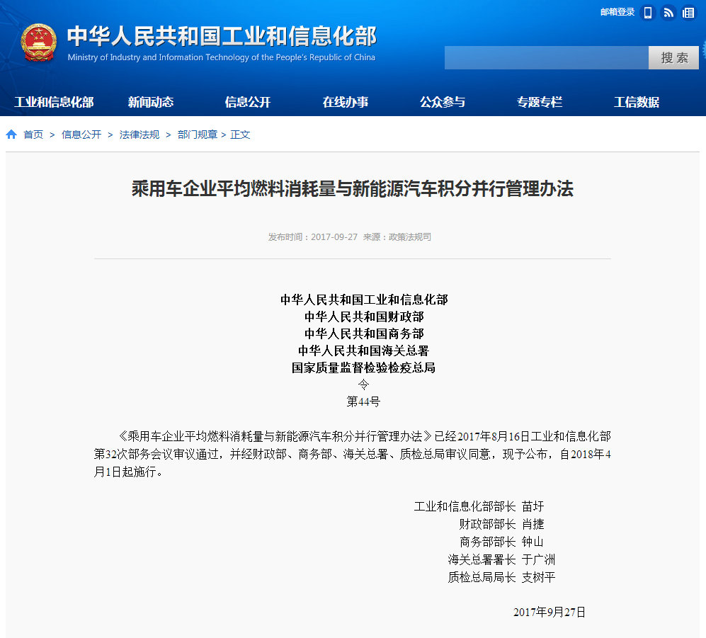 第三條 工業(yè)和信息化部會同財政部、商務(wù)部、海關(guān)總署、質(zhì)檢總局實施乘用車企業(yè)平均燃料消耗量與新能源汽車積分管理。