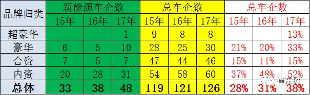 上表是按照品牌銷售的廠家口徑的數(shù)量,與合格證的廠家生產(chǎn)法人的口徑相對簡化,但權(quán)威的仍是法人單位的統(tǒng)計(jì)角度。對18年實(shí)施雙積分的最初的預(yù)期是企業(yè)能迅速推動(dòng)插電混動(dòng)和純電動(dòng)的均衡發(fā)展,合資企業(yè)能夠推出新能源車。世界新能源車的隨著油價(jià)下跌的需求不旺,發(fā)展新能源車的熱情不高,新品推出不強(qiáng)。而合資企業(yè)的新能源車缺乏研發(fā)能力,外方導(dǎo)入需要一定時(shí)間,進(jìn)度相對較慢。因此17年的合資企業(yè)推出新能源車的有7家占比15%,內(nèi)資企業(yè)推出新能源車的有31家,占52%。