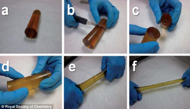 在實(shí)驗(yàn)中,研究人員將一段樣品材料切斷后再推回到一起,在兩個(gè)小時(shí)內(nèi),樣本的97%已告“痊愈”——看似完全融合在一起,在用手向兩端拉伸時(shí)其仍然牢固。該中心科學(xué)家阿萊茨·里孔多、羅伯特·馬丁等人表示,新材料的突破點(diǎn)是在室溫環(huán)境下,表現(xiàn)出了定量的自愈合效率,而不需要施以熱或光等任何外部干預(yù)。