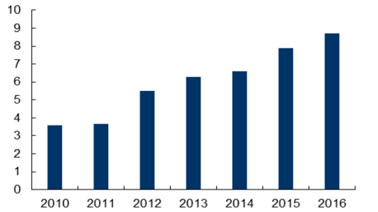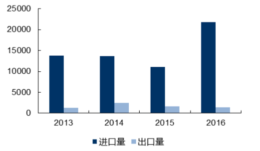 多年來,我國碳酸鋰生產(chǎn)規(guī)模無法滿足國內市場需求,且產(chǎn)品主要集中在工業(yè)級碳酸鋰、氫氧化鋰等生產(chǎn)難度小、附加值低的傳統(tǒng)鋰產(chǎn)品,高端鋰產(chǎn)品部分依賴進口,2016年碳酸鋰進口量2.12萬噸,同比增長了97%。