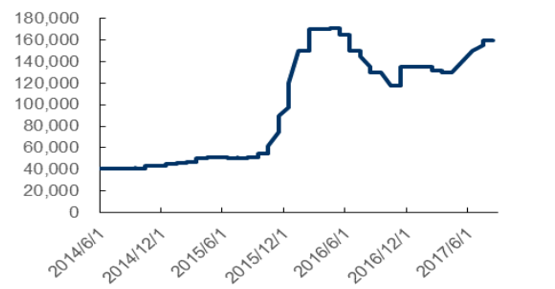 電池級碳酸鋰價格已是2014年的4倍(元/噸)