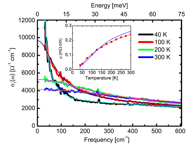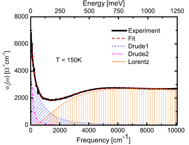 圖2 光電導(dǎo)曲線可以分解為一個寬的Drude, 一個窄的Drude (分別代表兩種具有不同散射率的載流子), 和Lorentz項 (表示帶間躍遷)。