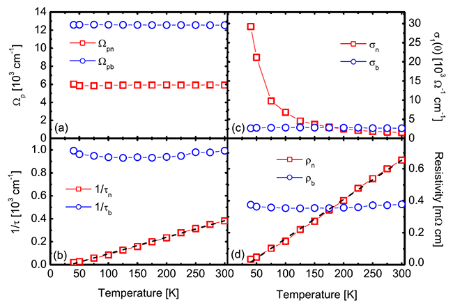 圖3 兩個Drude的溫度依賴。(b)和(d)兩個面板分別是散射率和等效電阻對溫度的依賴關(guān)系,其中的兩條黑色虛線是線性擬合的結(jié)果。