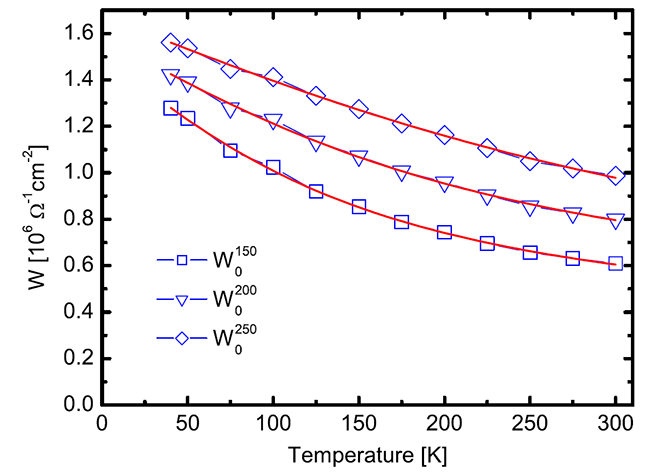 圖4 低頻光電導(dǎo)譜權(quán)重隨溫度的變化曲線。3個不同截止頻率對應(yīng)的曲線都滿足arctan(T)的關(guān)系。