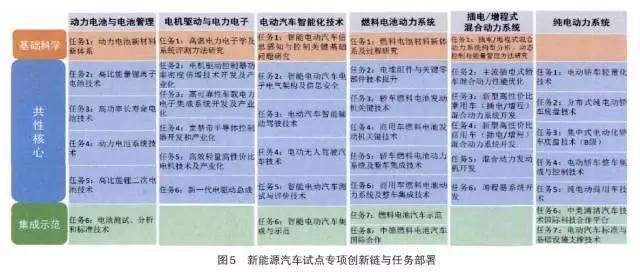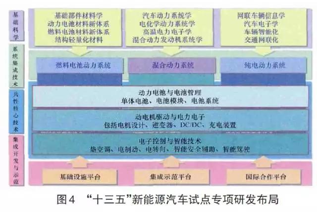 1)研發(fā)布局。“十三五”新能源汽車試點(diǎn)專項(xiàng)總體布局,按照全創(chuàng)新鏈設(shè)計(jì)原則分為 4 個層次:基礎(chǔ)科學(xué)問題、共性核 心技術(shù)、動力系統(tǒng)技術(shù)、集成開發(fā)與示范。每層有 3 個模塊: 三大基礎(chǔ)科學(xué)問題;“三橫”共性核心技術(shù);“三縱”動力系統(tǒng) 技術(shù);面向集成開發(fā)與示范的三大支撐平臺