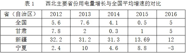 從2013年開始,西北主要省份的社會用電量增長出現(xiàn)明顯下降和波動(見表1),新疆社會用電量波動最大,從2013、2014年的31%下降到2016年的12%,降幅近20個百分點。寧夏、青海到2016年變成了負增長。只有甘肅從2013年的2.0%上升到2016年的5.0%,電力需求增速與全國平均持平。而東部、中部用電量同比分別增長5.9%、5.4%,是全國用電增長的主要拉動力。