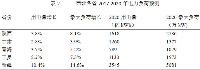 根據(jù)我們的研究,隨著第三產(chǎn)業(yè)及居民用電占比提高,電力系統(tǒng)的負荷率總體呈下降趨勢,因此最大負荷增長會快于電量增長。據(jù)此估算出西北各省2020 年的用電量及最大負荷(見表2)。
