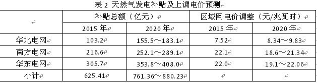 根據(jù)目前各省采取的補(bǔ)貼和電價疏導(dǎo)兩種方式,對我國天然氣發(fā)電裝機(jī)較集中的華北電網(wǎng)、南方電網(wǎng)和華東電網(wǎng)三個區(qū)域電網(wǎng),對天然氣發(fā)電上網(wǎng)電價高出燃煤標(biāo)桿電價部分采用政府補(bǔ)貼和上調(diào)電價全網(wǎng)平攤消化兩種方案進(jìn)行測算,結(jié)果見表2。