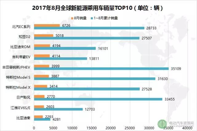 2017年1-8月全球新能源乘用車累計銷量排行中,豐田普銳斯1-8月累計銷售35109臺,位居第一;日產聆風銷售了33455臺,排在第二位;排在第三的是特斯拉Model S,1-8月累計銷售31630臺。排在第4-10位的新能源乘用車分別為:北汽EC系列(28733臺)、特斯拉Model X(27528臺)、知豆D2(27507臺)、雷諾Zoe(21859臺)、寶馬i3(20531臺)、雪佛蘭Volt(17444臺)、比亞迪宋DM(16101臺)。