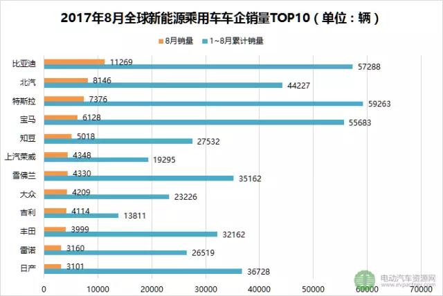 2017年1-8月全球新能源乘用累計銷量排在前十的車企分別為:特斯拉(59263臺)、比亞迪(57288臺)、寶馬(55683臺)、北汽(44227臺)、日產(36728臺)、雪佛蘭(35162臺)、豐田(32162臺)、知豆(27532臺)、雷諾(26519臺)、大眾(23226臺)。