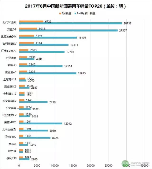 2017年8月中國新能源乘用車銷量排行中,北汽EC系列奪得了冠軍,8月銷售6726臺;知豆D2銷售了5018臺,排在第二位;排在第三的是比亞迪宋DM,8月銷售4194臺。