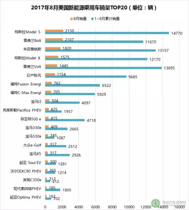 2017年8月美國新能源乘用車銷量排行中,特斯拉Model S奪得了冠軍,8月交付2150臺;雪佛蘭Bolt銷售了2107臺,排在第二位;排在第三的是豐田普銳斯,8月銷售1820臺。