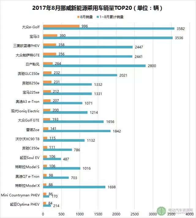 2017年8月,挪威新能源乘用車銷售了五千余臺, 1-8月新能源乘用車累計銷量3.6萬臺。從挪威汽車市場來看,新能源乘用車已經占據了高達35%的市場份額。
