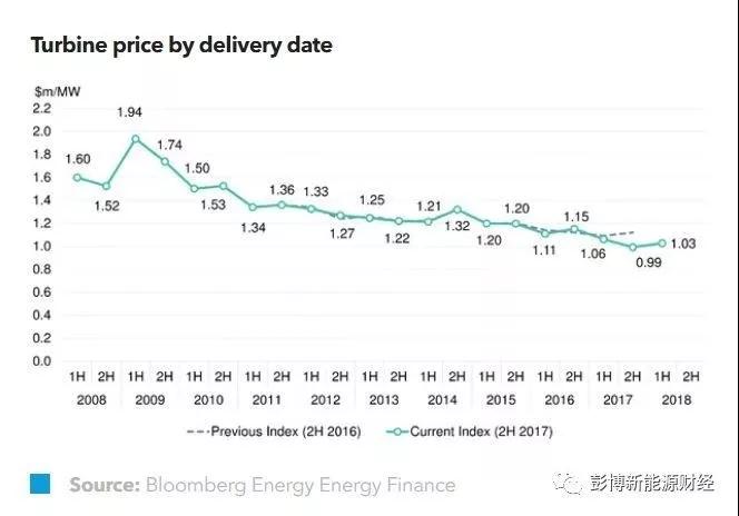 風機造價從2009年上半年的每兆瓦194萬美元跌至2017年下半年的每兆瓦99萬美元,下降了49%。而風機發(fā)電平準價格則從2009上半年的每兆瓦時914美元/年降至2017下半年的每兆瓦時300美元/年,下降了68.2%。