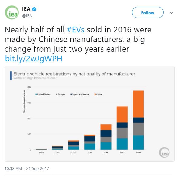 在電動(dòng)汽車(chē)方面,中國(guó)已經(jīng)做到全球行業(yè)發(fā)展的領(lǐng)跑者。2016年中國(guó)銷(xiāo)售電動(dòng)汽車(chē)33.6萬(wàn)輛,幾乎是全球銷(xiāo)售總量的一半,中國(guó)新能源汽車(chē)的保有量也在全球占比過(guò)半。