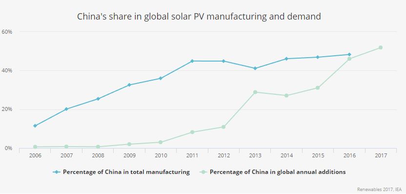 國(guó)際能源署(IEA)在2017年可再生能源報(bào)告中稱,中國(guó)已占全球太陽(yáng)能電池制造總產(chǎn)能的60%,占全球光伏裝置使用和需求的50%。2016年,全球范圍光伏裝置的增長(zhǎng)率首次超過(guò)其他能源載體,主要原因就是中國(guó)帶領(lǐng)美國(guó)和印度的光伏裝置增加。因此,中國(guó)的市場(chǎng)和政策變化,將影響到全球光伏裝置的供求與價(jià)格。