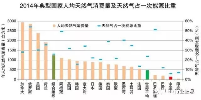 ? 2014年,中國人均天然氣消費量135立方米,天然氣占一次能源消費總量的比重約為6.0%;而全球人均消費水平分別為467立方米和23.7%。