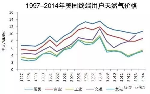 ? 美國:居民用氣價格最高,超過發(fā)電和工業(yè)用氣價格的2倍。2014年,居民用氣價格10.67美元/MMBtu,發(fā)電用氣價格為5.05美元/MMBtu。