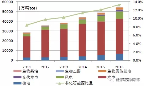 圖1 2011~2016年非化石能源的能源折算量及非化石能源比重