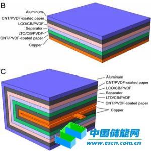 研究人員使用碳納米管(CNT)包覆的紙作為集流器,將傳統(tǒng)的活性物質層(Li4Ti5O12和LiCoO2)置于集流器頂部。使用實驗室用擦拭紙作為基底,因為其薄而多孔的特性允許CNT墨水輕易滲透紙的內外層,使CNT包覆的紙每一面都具有導電性。
