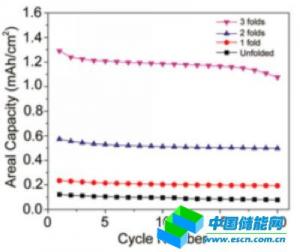 為了進一步提高區(qū)域容量,研究人員使用三浦折疊法(Miura folding)。在這些三浦折疊電池中,由于銅電流或者鋁電流不能被多次折疊,因此不再使用。此外,使用CNT-PVDF包覆的紙作為唯一的集流器。