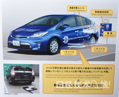 豐田在會場展示的是以該公司的插電式混合動力車(PHEV)“普銳斯PHV”為原型、嵌入磁共振方式無線充電系統的車輛。該車配備的無線充電系統的輸出功率為2kW。關于使用的頻帶,豐田表示,“打算把85kHz作為第一選擇”。盡管該公司以前也公開過無線充電試制車輛,但此次試制車配備的系統縮小了受電線圈及外圍部件的尺寸。解說員介紹說,“重新進行了熱設計,修改了原來過于冗余的散熱措施”。