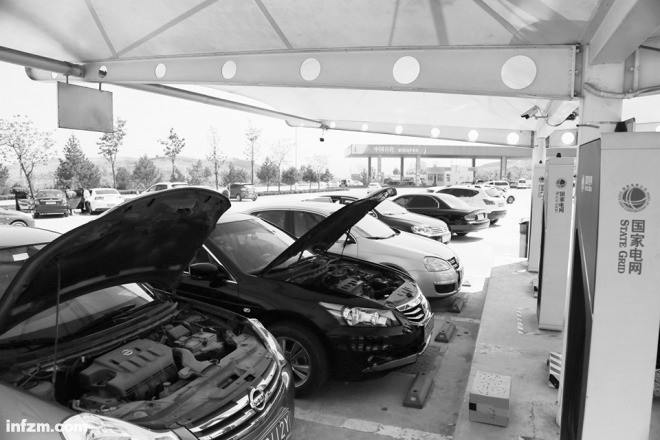 2017年5月1日,山東濟南高速公路章丘服務站已引入新能源充電樁與專用充電車位,方便新能源車輛充電。(視覺中國/圖)