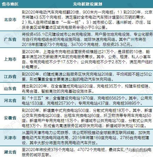 根據(jù)前瞻產(chǎn)業(yè)研究院發(fā)布的《2017-2022年中國電動汽車充電樁行業(yè)發(fā)展前景預測與投資戰(zhàn)略規(guī)劃分析報告》統(tǒng)計,目前有20余個省市發(fā)布了電動汽車充電樁規(guī)劃,匯總?cè)缦拢?