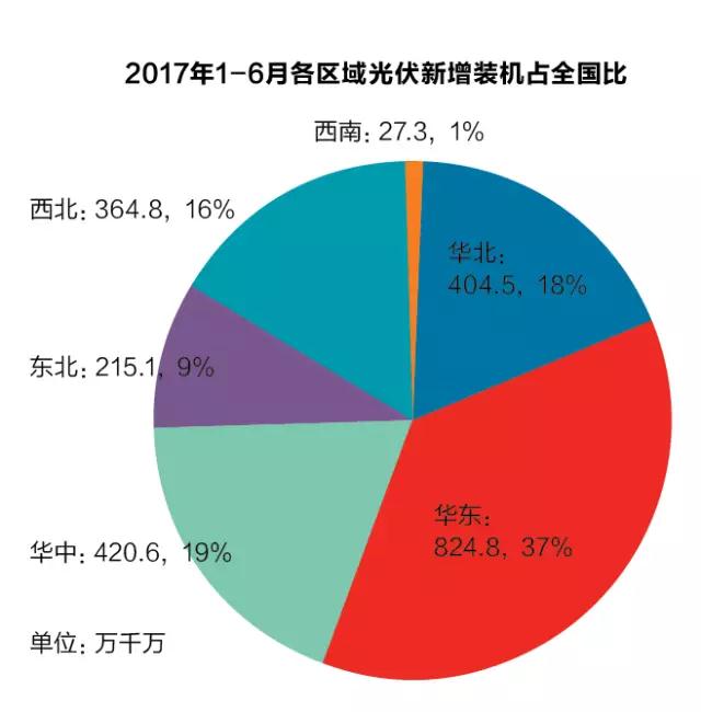 同時,光伏開發(fā)布局由西北地區(qū)向中東部地區(qū)轉移的趨勢更加明顯。1-6月,華東地區(qū)新增裝機為825萬千瓦,同比增加1.5倍,占全國的34%,其中浙江、江蘇和安徽三省新增裝機均超過200萬千瓦。華中地區(qū)新增裝機423萬千瓦,同比增加37%,占全國的17.3%。西北地區(qū)新增裝機為416萬千瓦,同比下降50%。