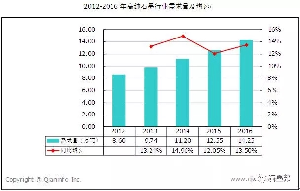 中國儲能網(wǎng)訊:2012年,我國高純石墨需求量為8.60萬噸,2013年我國高純石墨需求量為9.74萬噸,同比增長13.24%,2014年,我國高純石墨需求量為11.20萬噸,同比增長14.96%,2015年,我國高純石墨需求量為是12.55萬噸,同比下降12.05%,2016年,我國高純石墨需求量為14.25萬噸,同比增長13.50%。
