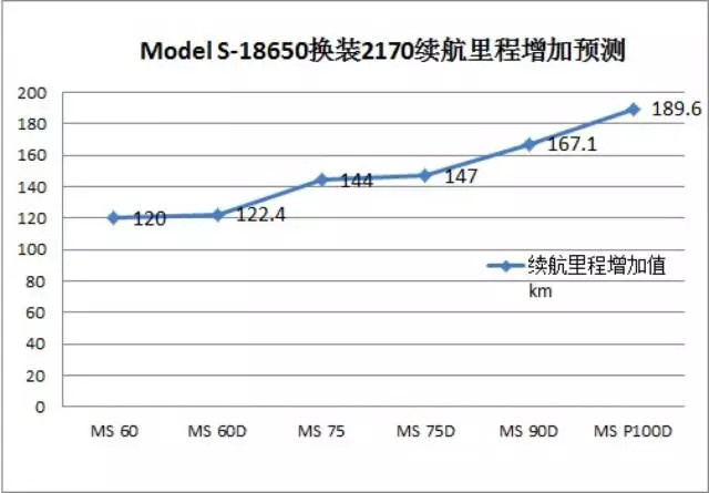 我們可以看下若特斯拉model S或者model X 18650電池替換為最新的21700電池,續(xù)航里程的增加情況:電池容量增幅估計為30%,由于21700的體積比18650增加46%,考慮電池體積增加與容量的非線性關(guān)系并作保守估計取為30%的電池容量增幅。